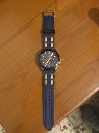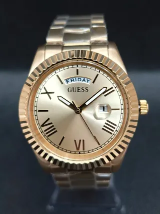 Brand: GUESS Movement: Quartz Display: Analog chronograph Case: Rose gold–tone stainless steel Strap: Blue silicone (original GUESS) Dial: Blue textured dial with rose gold markers Water resistance: 100 m / 330 ft Functions: • Chronograph • Date display • Luminous hands • Screw-back case Condition: ✔ Fully working ✔ Normal cosmetic wear from use (light scratches visible on case back) ✔ Strap in good condition ✔ No box or papers Size (approx.): • Case diameter: ~45 mm • Strap width: ~22 mm Sporty and stylish GUESS chronograph with a bold blue & rose gold color combination — perfect for casual or sporty outfits.