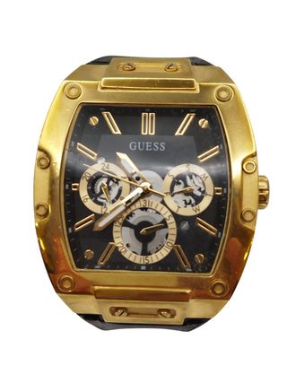Elegante reloj Guess Phoenix para hombre con un llamativo acabado dorado y detalles en negro. - Diseño rectangular. - Correa de cuero negra. - Esfera con múltiples subesferas.
