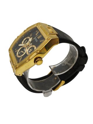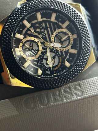 Elegante reloj Guess para hombre con detalles en dorado y negro. Un accesorio llamativo y moderno. - Diseño con múltiples esferas. - Correa de material resistente. - Bisel texturizado.