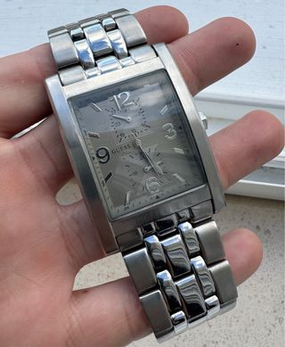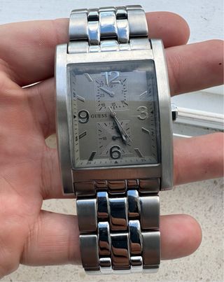 Reloj Guess Vintage para hombre Elegante y atemporal diseño rectangular de acero inoxidable. Modelo Guess original, con esfera grabada y números grandes, muy distintivo y con estilo clásico. Correa metálica de eslabones gruesos, sólida y cómoda. Funciona perfectamente, listo para usar. Un reloj antiguo y valioso, ideal tanto para colección como para uso diario. Pieza con carácter y diseño inconfundible de los años dorados de Guess. Un toque vintage con toda la elegancia de la marca Guess.