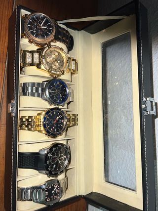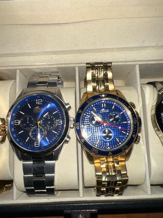 Conjunto de relojes para hombre. - Diseño con detalles dorados y plateados. - Estilo elegante y moderno. -Relojes que han sido usados se uso diario pueden tener roces arañazos etc... -Los vendo por ampliar colección no me los pongo ya. -Los puedo vender separados preguntar -Todos tienen eslabones aparte -Todos son originales lotus guess festina marea