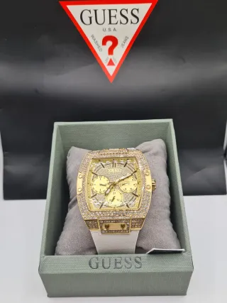 Elegante reloj Guess para hombre con un diseño llamativo. SE VENDE PORQUE ES UN REGALO Y TENGO OTRO IGUAL, NO TIENE NI UN SOLO USO SE CONSERVAN SUS PLASTICOS - Esfera dorada con detalles. - Correa de color blanco. - Bisel adornado con pedrería.