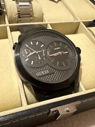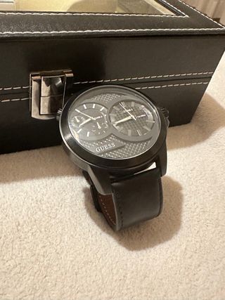 Reloj Guess negro de cuero para hombre, me lo he puesto pocas veces y no lo he vuelto a usar porque tengo colección, esfera intacta y correa solo forma de la muñeca. Siempre ha estado en joyero como se ve en las fotos.