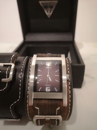 Reloj de acero inoxidable Guess de Hombre . movimiento de Cuarzo analógico . caja de acero inoxidable ,segundero. Brazalete de Piel con hebilla de acero inoxidable . Cristal mineral. . tamaño de 36 mm. Formato 12/24 horas. . resistente al agua 30 m.