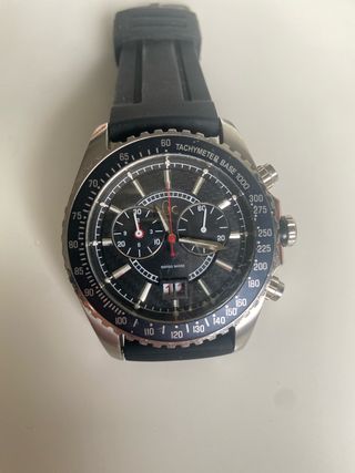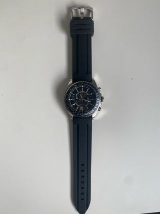RelojGuess con cronógrafo y bisel taquímetro. -100m wateresistant - Esfera negra con detalles plateados. - Correa de caucho negra nueva. - Indicador de fecha. - recien revisado, bateria, juntas nuevas, correa nueva y prueba de estanqueidad. - bisel von detalles de carbono. - el cristal tiene arañazos leves.