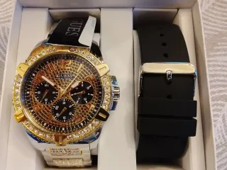 Elegante reloj Guess con un diseño llamativo. - Bisel adornado con cristales. - Esfera con detalles dorados y manecillas plateadas. - Correa de eslabones en tonos dorado y plateado. - Incluye una correa adicional de silicona negra.