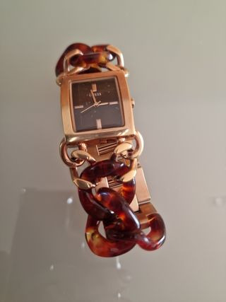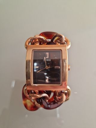 Reloj Guess chapado oro rosa, combinado en pasta acetato. Se ajusta facil con cierres.