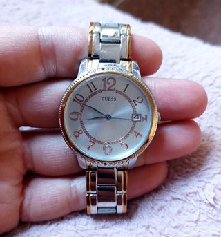 Elegante reloj de Guess con un diseño bicolor que combina tonos dorados y plateados. Perfecto para añadir un toque de estilo a cualquier atuendo. - Bisel con detalles brillantes. - Esfera clara con números y manecillas en contraste. - Brazalete de eslabones combinando los dos tonos Le faltan 2 piedras funciona perfectamente