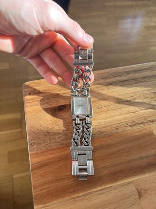 Reloj GUESS original, referencia 180305L1, estética Y2K / años 2000. Caja rectangular de acero y brazalete de doble cadena, movimiento cuarzo japonés (Japan Movt). Funciona correctamente. Presenta desgaste estético normal por la edad (ver fotos), sin golpes graves. Ideal para looks retro, streetwear o colección vintage.