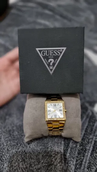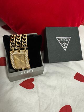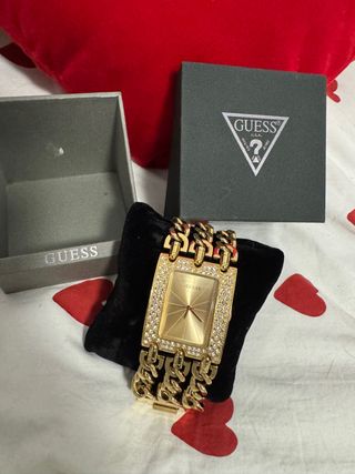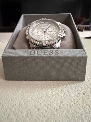Reloj Guess original, cronógrafo, acabado en dorado y decorado con cristales Swarovski auténticos, que aportan un brillo elegante y muy llamativo. Diseño sofisticado y de gran presencia, ideal tanto para ocasiones especiales como para elevar cualquier look diario. Funciona perfectamente y se encuentra en muy buen estado, bien cuidado. Se entrega con caja original Guess, ideal también como regalo. Un reloj de marca reconocida, con estética de lujo, a un precio muy inferior al de tienda.