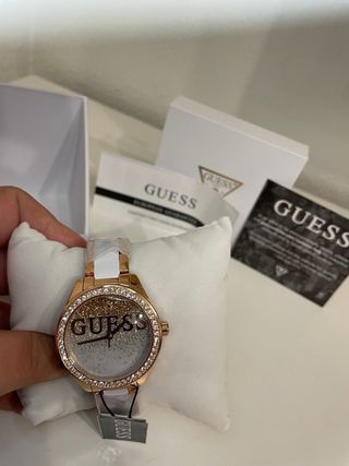 Este elegante y moderno reloj, adornado con hermosas piedras, es el regalo perfecto para Año Nuevo, navidad, cumpleaños, San Valentín y otras ocasiones especiales. Descripción: - Modelo: U1275L3 - Marca: Guess - Correa de acero inoxidable color oro rosa de alta calidad, de 19 cm de largo y 37 mm de ancho, con cierre desplegable. - Diámetro de la caja: 43 mm, altura de la caja: 10 mm, color de la caja: oro rosa, color de la esfera: oro rosa. - Resistente al agua: 3 bar/atm. - Peso: 166 gramos. El reloj se entrega en su caja de regalo original y cuenta con una garantía de 2 años. Está nuevo sin estrenar.