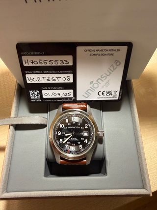 Reloj Hamilton Khaki Field automático con correa de cuero marrón. - Referencia: H70555533 - Número de serie/edición limitada: BC2TZGT08 - Fecha de compra: 01/09/25 - Movimiento automático. - Esfera negra.