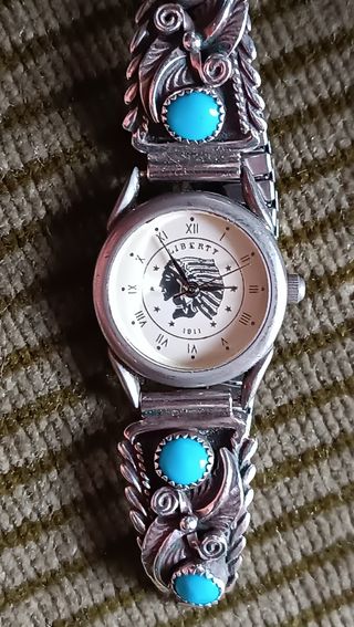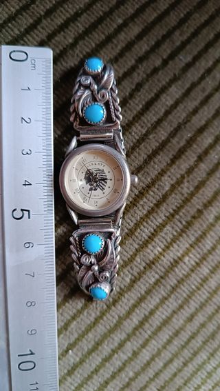 Vendo reloj único de auténtico estilo Navajo, fabricado en plata de ley de alta calidad (marcado como 'Sterling'). El reloj destaca por su precisa fabricación artesanal, característica de los maestros Navajo. Está decorado con seis hermosas piedras turquesas azules, rodeadas de detallados ornamentos de plata con motivos de hojas.