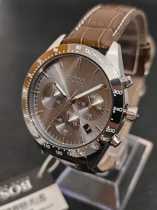 Reloj Hugo Boss 1514121 Un reloj cronógrafo deportivo de acero inoxidable de BOSS, con una esfera negra de múltiples esferas y una correa de cuero con la marca distintiva de rayas. Caja de 44 mm y 5 ATM