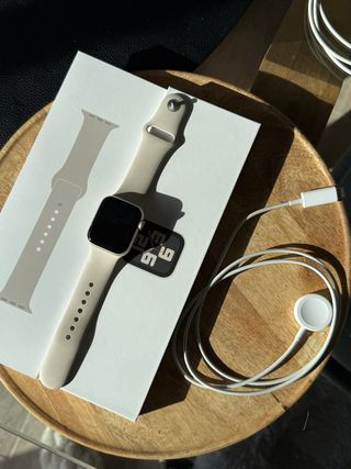 Reloj inteligente Apple Watch con correa en tono beige y detalles plateados. - Pantalla digital. - Correa de silicona. - Cargador magnético incluido. 40mm batería 91%