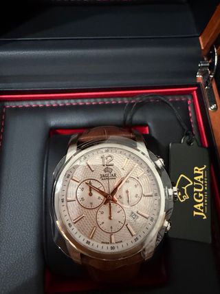 Elegante reloj Jaguar con detalles dorados y esfera azul. - Caja de madera de presentación. - Documentación de cumplimiento normativo. - Esfera con cronógrafo. - Brazalete de eslabones dorados. Comprado dia 12/09/2025 Tiene la garantia sin sellar, la primera reparacion es gratis y ya luego el joyero te sella la garantia y tendras 2 años