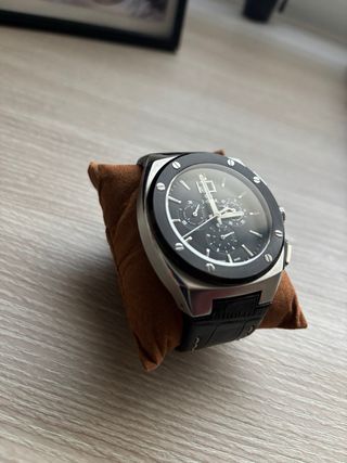 Elegante reloj Jaguar con detalles en negro y plateado. - Diseño moderno y sofisticado. - Correa de cuero negra. - Bisel plateado.