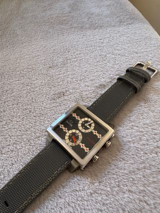 Elegante reloj Jaguar con un diseño moderno y sofisticado. - Fibra de carbono - Caja cuadrada. - Correa de tela. - Detalles en rojo en la esfera.