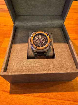 Elegante reloj de pulsera suizo para hombre de la marca Jaguar. Reloj con cronómetro - Diseño bicolor en negro y dorado. Correa acero inoxidable. - Presentado en su caja original.