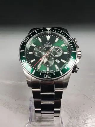 Elegante reloj Jaguar Chrono con esfera verde y detalles plateados. Swiss made. Modelo J872. Perfecto estado. - Bisel giratorio verde. - Cronógrafo con subesferas. - Correa de eslabones plateada. - Resistente al agua (Swiss Made).