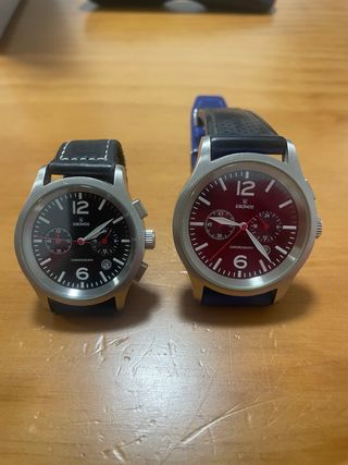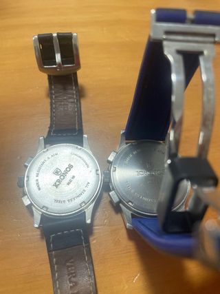 Dos relojes KRONOS con cronógrafo, uno con esfera negra y otro con esfera roja. - Caja de acero inoxidable. - Correa de cuero negra. - Correa de cuero azul. - Resistente al agua.Los dos por 40€