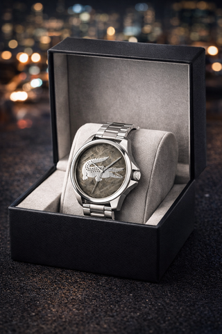Elegante reloj Lacoste con esfera negra y detalles plateados. - Diseño moderno y versátil. - Correa de metal. - Resistente al agua.