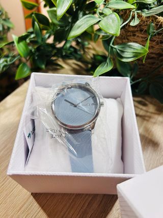 Elegante reloj de pulsera con correa. - Diseño moderno y minimalista. - Correa texturizada. - Cierre de hebilla plateada.