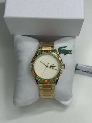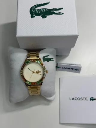 Elegante reloj Lacoste con detalles en dorado.nuevo a estrenar - Correa de material texturizado. - Esfera con marcadores dorados. - Logo del cocodrilo en la esfera.