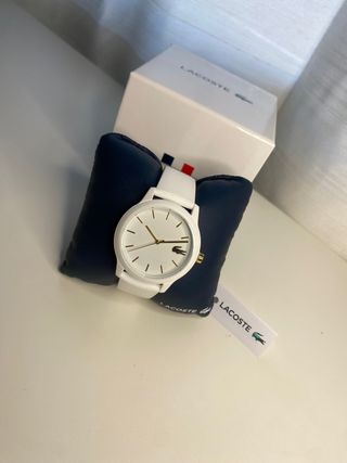Reloj analógico marca la coste. Blanco y dorado. Resistente al agua 5ATM. Pulsera de silicona. Diámetro de 3,6 cm. NUEVO con etiquetas. Sin usar. Lacoste verdadero.