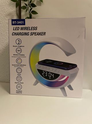 Altavoz multifuncional con luz LED y carga inalámbrica. - Función de altavoz Bluetooth. - Carga inalámbrica para dispositivos compatibles. - Iluminación LED con siete selecciones de color. - Función de reloj y despertador.