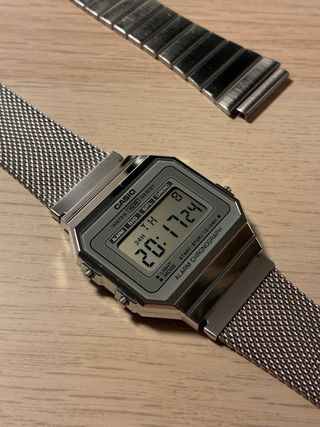 Reloj digital Casio A700 WEM-7A con correa de malla plateada. Incluye una correa adicional de eslabones plateados. En perfecto estado de funcionamiento: botones, sonido, alarma y luz led color ámbar. Algunas marcas de uso en la caja como se ve en las fotos, pero buen estado general. - Correa de malla metálica tipo Milanesa. - Correa de eslabones metálicos adicional también original de Casio para este modelo. SOLO ENVÍO