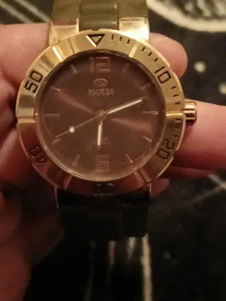 Elegante reloj Marea con un diseño moderno y atractivo. Combina tonos dorados con detalles en verde militar, ideal para complementar cualquier atuendo. - Bisel giratorio con marcadores. - Correa de material resistente. - Pila recién puesta en perfectas condiciones.