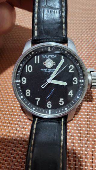 reloj Nautica.cristal de zafiro de muy buena calidad sin reflejos y muy resistente.numeros y manecillas luminiscentes Modelo A14555 - Esfera negra con detalles en blanco. - Correa de cuero negra con costuras blancas original y en buen estado .pila a estrenar