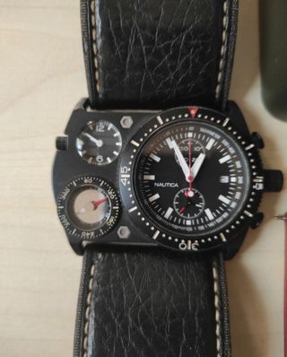 Bellissimo orologio Nautica cronografo, con doppio segna ora e bussola. Dalle foto si può vedere che l'unico difetto è la pelle sul retro del cinturino che si è un po' scurita e piccoli segni di utilizzo. Dotata di doppio cinturino e la scatola originale in metallo. L'orologio è funzionante e testato, c'è solo da cambiare la batteria al segna tempo piccolo.