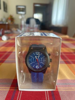 Reloj analógico azul de la marca Ohla!. Está completamente nuevo y sin usar. - Esfera de color azul oscuro. - Correa de silicona azul. - Movimiento de cuarzo.