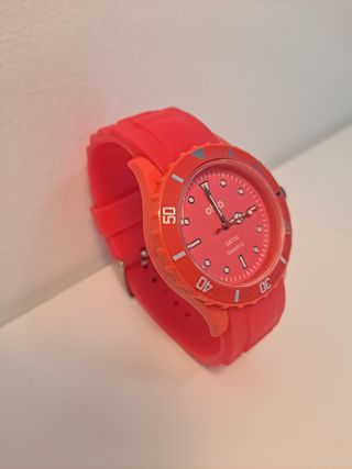 Reloj unisex fácil de combinar por su color. A fecha 09/02 con pila y en perfecto funcionamiento. Sólo se ha usado unos meses y aunque está en muy buen estado no puedo calificarlo "como nuevo". Puedes ver sus características en una de las fotos.