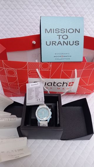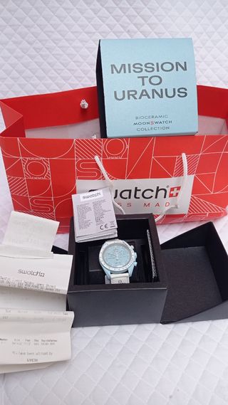 Reloj Omega x Swatch Mission to Uranus SIN ESTRENAR, con su pegatina y con el tiquet de compra. El color azul pastel (parecido al de Tiffany) de la esfera del reloj casa perfectamente con su correa blanca brillante de velcro. El segundero del cronógrafo, las agujas del contador y la escala taquimétrica también vienen en color blanco. Todas las esferas de los MoonSwatch llevan grabadas la marca OMEGA X SWATCH, el emblemático logotipo del Speedmaster y el nuevo logotipo de MoonSwatch. Los modelos comparten elementos como el acabado del cristal, la «S» oculta que se entrevé en su centro, etc. Se entrega en mano.