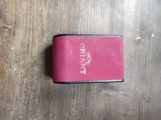 Esta es una caja para guardar un reloj de la marca Orient. Es de color rojo y tiene un diseño elegante. - Material exterior aterciopelado. - Borde negro. - Logo de Orient en relieve.