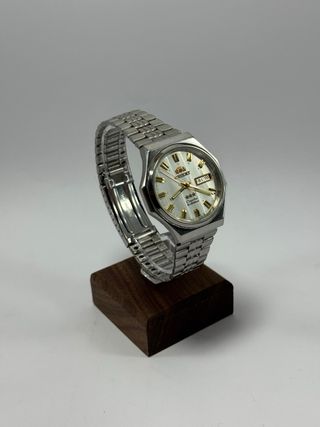 Reloj Orient automático con un diseño clásico y elegante. - Esfera con detalles en dorado. - Correa de eslabones plateada. - Ventana de día y fecha. Revisado por un relojero, todo funciona Se ve como nuevo Vendo en Valencia
