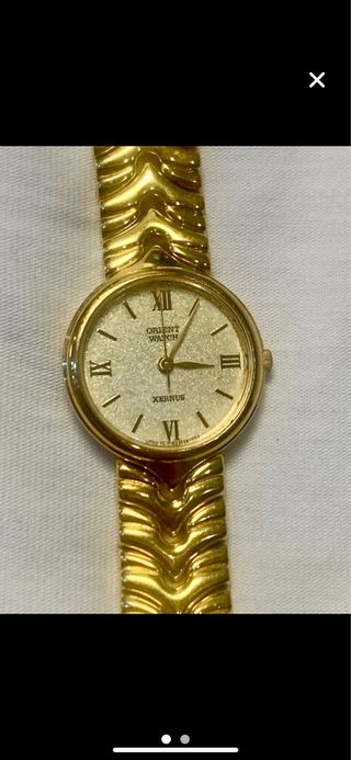 Reloj Orient original de mujer, de acero inoxidable en color dorado y esfera blanca. Movimiento de cuarzo japonés funcionando perfectamente. Estilo clásico y elegante, con diseño vintage ideal tanto para uso diario como para coleccionistas. Diámetro 32mm.