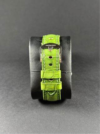 Correa de repuesto para reloj Panerai en color verde. Correa de repuesto para reloj Panerai. Ancho de banda : 24mm Valida para modelos : - Luminor; Luminor Marina, GMT y cualquier modelo con ancho entre asas de 24mm - Material de caucho negro, hidrogenado. Calidad optima (no endurece o parte con el uso y el tiempo) - Hebilla de acero inoxidable plateada con cierre deployante. - Envío o entrego con 2 tubos de refuerzo para el anclaje de los pasadores al reloj. Fotos reales hechas por mí
