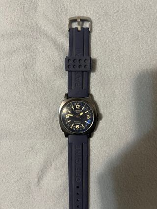 Reloj Panerai Luminor GMT con correa azul. - Esfera azul. - Correa de caucho azul con hebilla plateada. - Bisel plateado.
