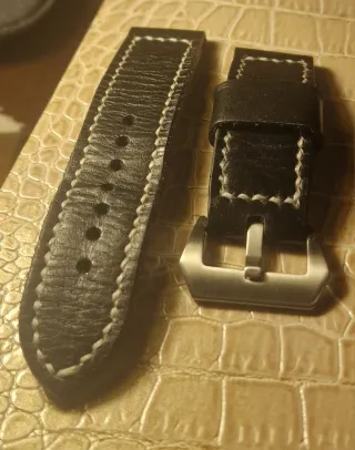 Correa de cuero premium para reloj, con un ancho de 24mm y un diseño inspirado en el estilo Panerai. La correa es de color negro con pespuntes en color blanco. - Gruesa, cómoda y de gran calidad., curtido vegetal. - Material: Cuero de alta calidad.,Hecho por maestro artesano a mano. - Costuras reforzadas en blanco. - Hebilla de acero inoxidable. Longines,Rolex, panerai, omega,seiko, hamilton...