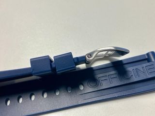 Correa de repuesto para reloj Panerai. - Color azul marino. - Hebilla de acero inoxidable plateada. - Inscripción PANERAI en la correa y la hebilla. - Inscripción OFFICINE en la correa.