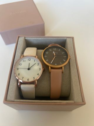 Set de dos relojes de la marca Parfois. - Esfera de color blanco y otra de color negro. - Cajas y agujas en tono dorado. - Correas de cuero en color beige y rosa palo.