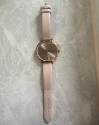 Elegante reloj de la marca Parfois con un diseño moderno. - Correa de piel en tono rosa pálido. - Esfera redonda en color dorado. - Bisel y detalles en tono oro rosa.