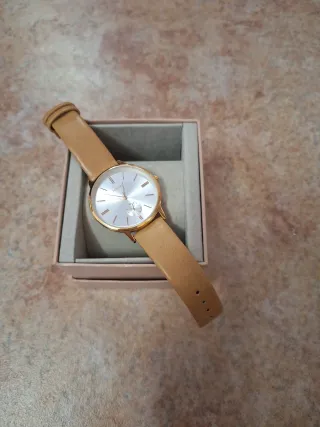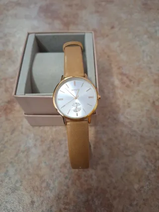 Elegante reloj con correa en color camel y detalles dorados. Ideal para complementar cualquier atuendo. - Diseño minimalista. - Correa de cuero. - Esfera redonda. - Se entrega con su caja.