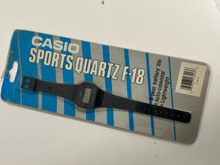 Reloj deportivo Casio F-18 en su empaque original. Un clásico de la marca. - Esfera digital. - Correa de resina. - Resistente al agua. - Batería de 5 años de duración. - Autocalendario. - Ligero. Lo encontre en una relojeria en cierre , desconozco si funciona , nunca se abrio