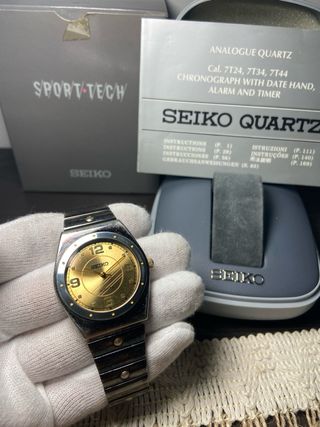 Reloj Seiko Quartz Sport Tech, fabricado en Japón, referencia 5Y91-6030 RQ, una pieza vintage muy interesante dentro de la línea Sport Tech de Seiko. 🔹 Detalles: • Marca: Seiko • Modelo: Sport Tech • Movimiento: Quartz • Calibre: 5Y91 • Referencia: 5Y91-6030 RQ • Origen: Japan • Número de serie: TL 808587 • Esfera dorada con índices aplicados • Caja y brazalete en acero • Cristal original 📦 Incluye: • Caja original Seiko • Papeles / manuales originales 🔧 Estado: Reloj vintage, en buen estado general acorde a su antigüedad. Presenta signos normales de uso (ver fotos), no afecta a su funcionamiento ni estética general.