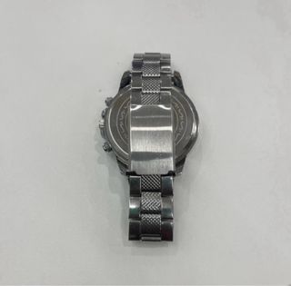 Reloj de pulsera con diseño deportivo y esfera azul. - Correa de eslabones plateada. - Tres subesferas en la pantalla. - Bisel con marcadores.